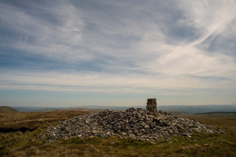 Eventually you can see the large cairn on top (not at the summit trig point) and then the summit trig point, which is also a kind of cairn / shelter. You just head as best you can in the direction of the left cairn which is home to the trig point.